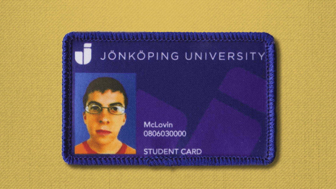 I have also worked on creating new merchandise for the storefront such as patches for the student overalls. This one is based on "McLovin's" ID-card from the movie "Superbad". The design is merged together with the design of the Student Cards of Jönköping University.